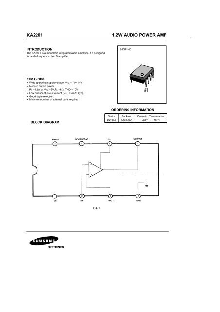 It is designed for audio frequency class B amplifier. Buy KA2201 SAMSUNG Learn more about KA2201 12W AUDIO POWER AMP View the manufacturer and stock and datasheet pdf for the KA2201 at Jotrin. List of Unclassifed Man.